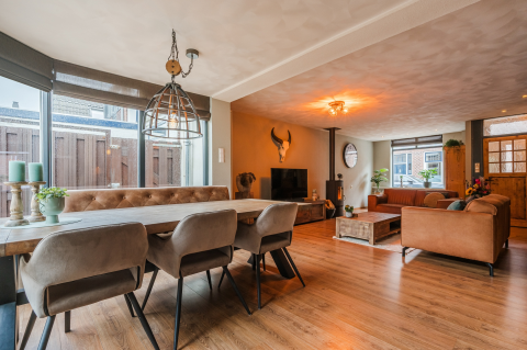Karaktervolle jaren ’20-woning in Bodegraven met een perfecte mix van authentieke charme en modern comfort. De lichte woonkamer met visgraatvloer opent via openslaande deuren naar de diepe, zonnige achtertuin op het westen – ideaal voor lange zomeravonden.